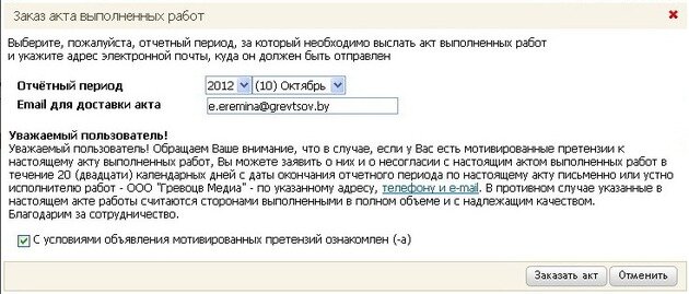 Обращаем Ваше внимание, что в случае, если у Вас есть мотивированные претензии к запрошенному и загруженному акту выполненных работ, Вы можете заявить о них и о несогласии с данным актом выполненных работ в течение 20 (двадцати) календарных дней с даты окончания отчетного периода по настоящему акту письменно или устно исполнителю работ - ООО "Гревоцв Медиа" - по указанному адресу, телефону и e-mail. В противном случае указанные в акте работы считаются сторонами выполненными в полном объеме и с надлежащим качеством.