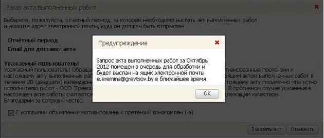 ВНИМАНИЕ: Акт выполненных работ можно запросить только за любой прошедший месяц. Текущий месяц не будет отображаться в выпадающем списке.