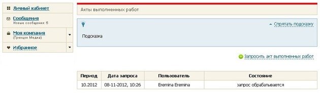 История заказа актов выполненных работ и статус обработки каждого запроса будет отображатся в таблице на странице во вкладке «Акты».